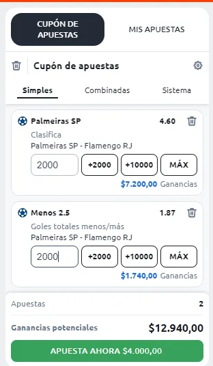- Establece el monto a arriesgar dentro del cupón de pago, en el mismo ticket, podrás optar por crear una apuesta en Betano simple, combinada o de sistema.