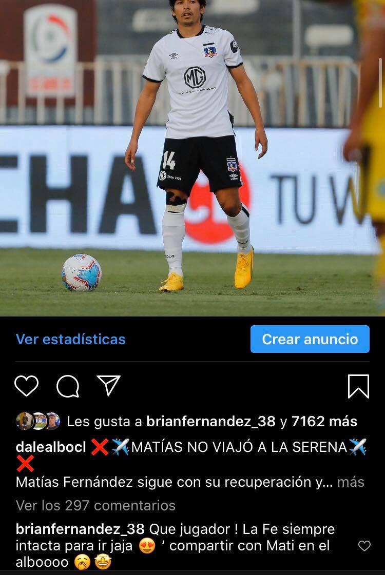 En medio de su batalla, el ex Unión La Calera, no se olvida de Colo Colo y aún guarda esperanza para recalar y volver ajugar con uno de sus referentes, Matías Fernández.“Qué jugador, la fesiempre intacta para ir y compartir con el Mati en el albo”, escribió en Instagram.