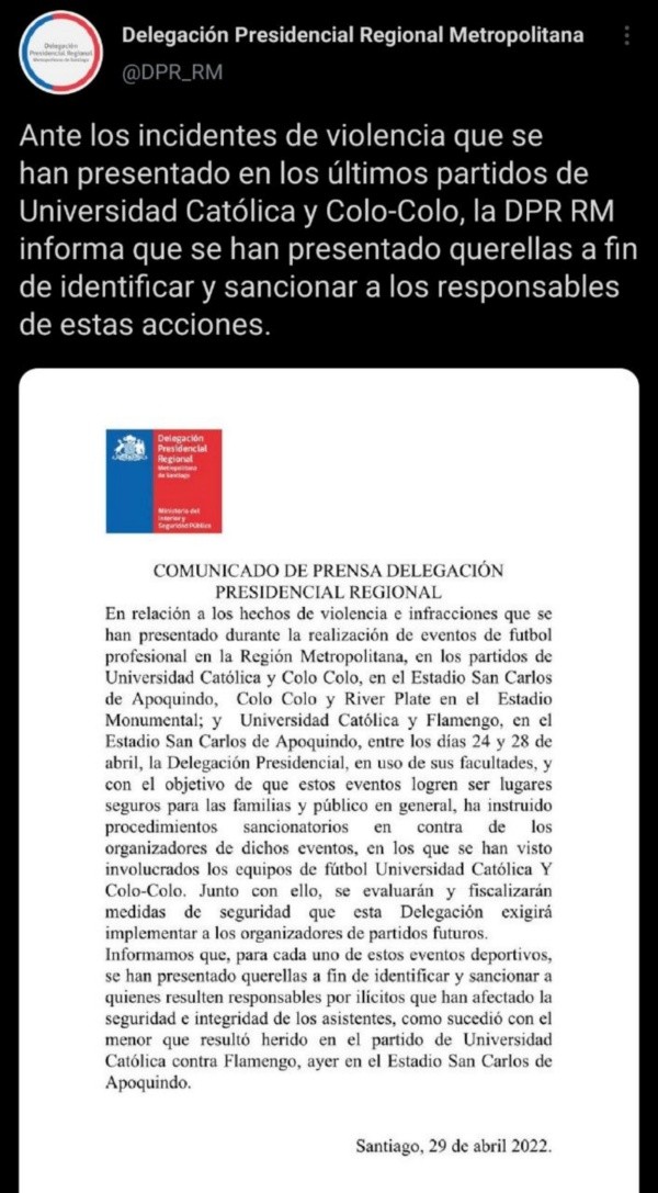 Mediante un comunicado, la Delegación Presidencial de la Región Metropolitana señaló que “en uso de sus facultades, y con el objetivo de que estos eventos logren ser lugares seguros para las familias y público en general, ha instruido procedimientos sancionatorios en contra de los organizadores de dichos eventos, en los que se han visto involucrados los equipos de fútbol Universidad Católica Y Colo Colo”, agregando los lamentables hechos que también ocurrieron en San Carlos de Apoquindo.
