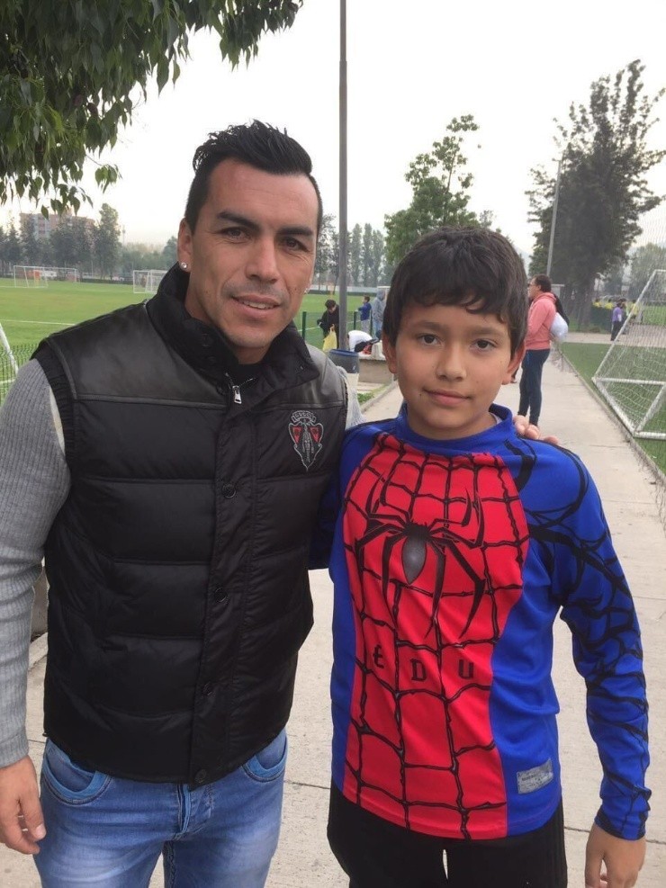 Edu Villanueva con 17 años mide 1.87 cm y en la foto del año 2016 con 11 años ya le llegaba a la cara del goleador albo. El juvenil es el gran proyecto en el arco colocolino y nacional.