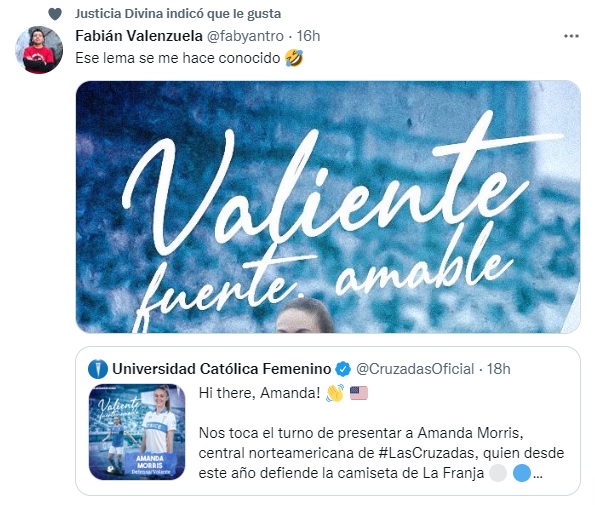 “Hi there, Amanda! Nos toca el turno de presentar a Amanda Morris, central norteamericana de Las Cruzadas, quien desde este año defiende la camiseta de La Franja”, publicó la UC en sus redes sociales dedicadas a la rama femenina.