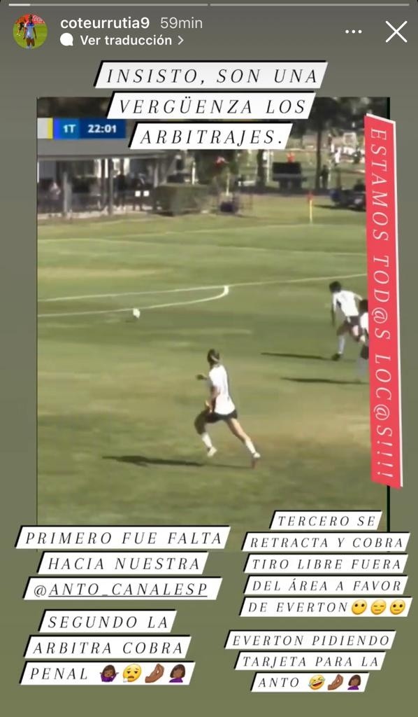 A través de sus redes sociales, la histórica delantera no tuvo pelos en la lengua y le cayó con todo al arbitraje. “Primero, fue falta hacia nuestra Antonia Canales. Segundo, la árbitra cobra penal. Tercero, se retracta y cobra tiro libre fuera del área a favor de Everton”, soltó en primera instancia.