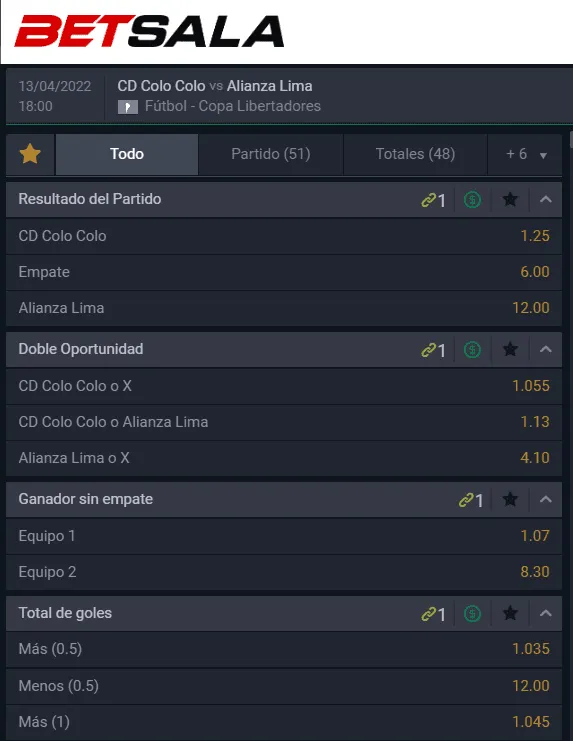 Betsala, la Sala de los Campeones, te cuenta que el favorito para ganar este partido de Copa Libertadores, en su segunda fecha de la fase de grupos, es Colo Colo, que paga 1,25 veces lo que juegues, por sobre los 12,00 que paga Alianza Lima si crees que los “Íntimos” vencen en el Monumental. Ahora, si te la juegas por el empate, paga 6,00 veces lo que apuestes.