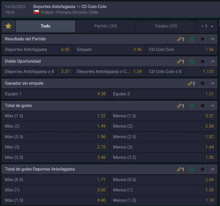 Para Betsala, el favorito para ganar en este partido es Colo Colo, que paga 1,56 veces lo que juegues, por sobre los 6,00 que paga Deportes Antofagasta si crees que ellos vencerán. Ahora, el empate entre ambos paga 3,96 veces lo que juegues.