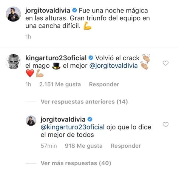 El King se rindió a los pies del “10” y le escribió “Volvió el crack. El Mago. El Mejor Jorge Valdivia”,a lo que el volante de Colo Colo respondió: “Ojo, que lo dice el mejor de todos”.