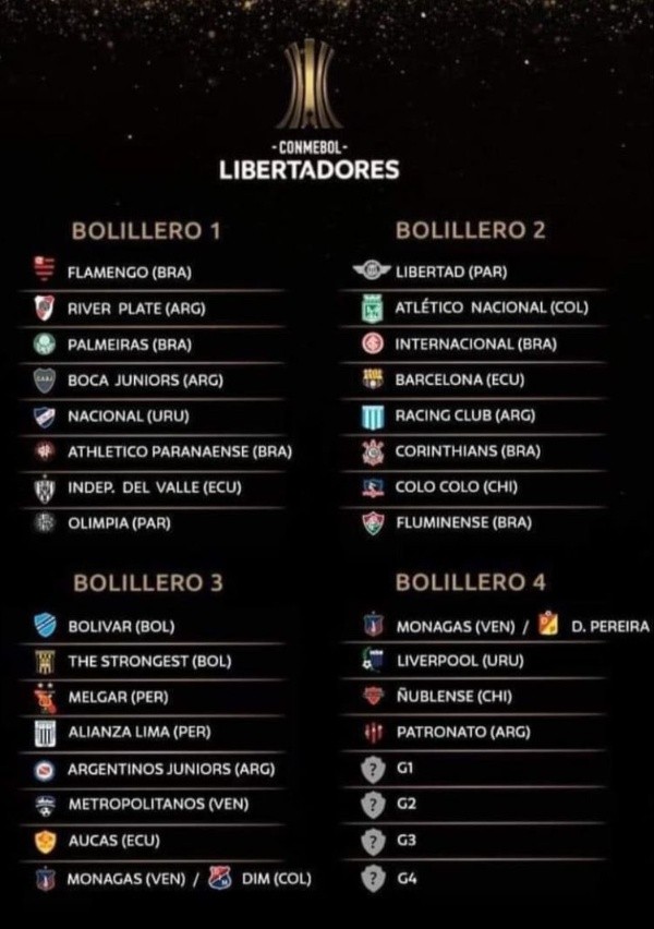 Bombo 4: Mongas-Deportivo Pereira, Liverpool, Ñublense, Patronato, G1, G2, G3 y G4.