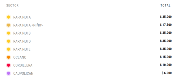 Los precios de los tickets va desde los $6.000, que costará galería hasta los $35.000, que vale Rapa Nui. A ello, se sumará que en las localidades Oceáno, Cordillera, Caupolicán, Tucapel, Lautaro, Galvarino y Rapa Nui A, existará un precio menor para los niños.