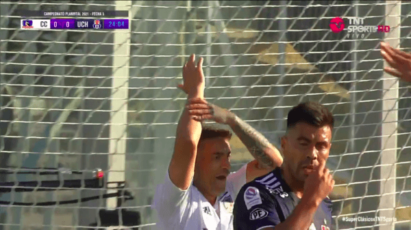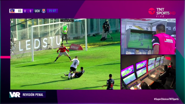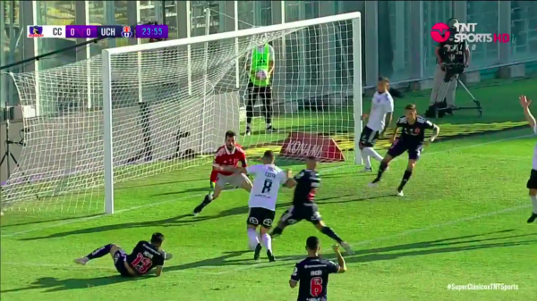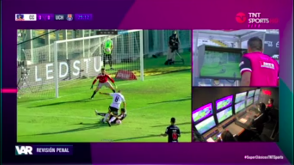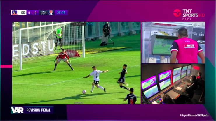Todos los colocolinos reclamaron penal y Julio Bascuñán tuvo que recurrir al VAR. Si bien sentenció que la jugada había sido mano dentro del área, no lo cobró por previa infracción de Costa, generando la primera polémica del partido.