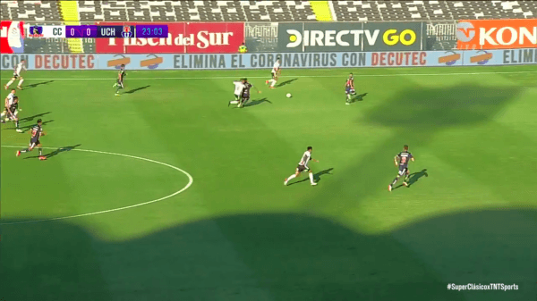Sin embargo, la salida del Cacique encontró un momento de claridad en los pies de Leonardo Gil, quien se la cede a Iván Morales y este se la devuelve a Gabriel Costa, quien se mandó hacia el arco custodiado por Fernando De Paul. Sin embargo, el delantero peruano no sacó nunca el remate y cuando por fin se decidió se encontró con el codo de Camilo Moya.