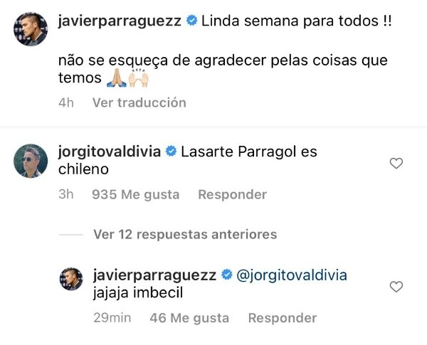El Mago utilizó un término que está de moda y le pidió a Machete que nomine al atacante para esta última fecha doble de Eliminatorias, señalando un “Lasarte, Parragol es chileno”, a lo que el jugador del Sport Recife le contestó con un “jajaja imbecil”.