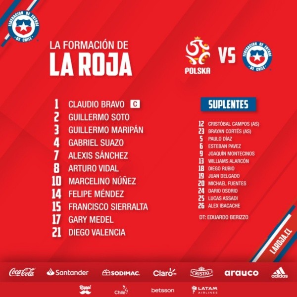 La formación es la siguiente: Claudio Bravo; Guillermo Soto, Guillermo Maripán, Francisco Sierralta, Gabriel Suazo; Gary Medel, Felipe Méndez; Arturo Vidal, Marcelino Núñez; Alexis Sánchez y Diego Valencia. En la banca están los colocolinos Esteban Pavez y Brayan Cortés.