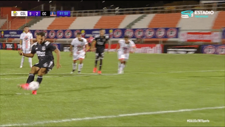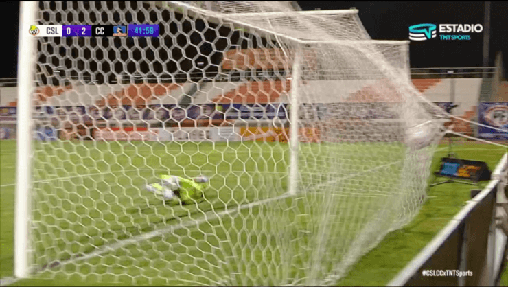 Leandro Requena no pudo adivinar las intenciones del atacante, quien sacó un remate fuerte al palo izquierdo del meta y consigue una importante ventaja para los de Gustavo Quinteros antes de irse al descanso.