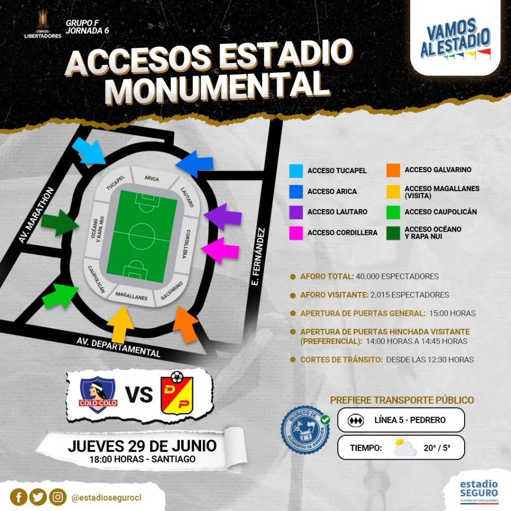 Cabe recalcar que el encuentro se disputará a las 18:00 horas, por lo que las puertas para el hincha colocolino se abrirá a las 15:00, tres horas antes del partido. Para los simpatizantes colombianos, el ingreso será en un solo horario: de 14:00 a 14:45.