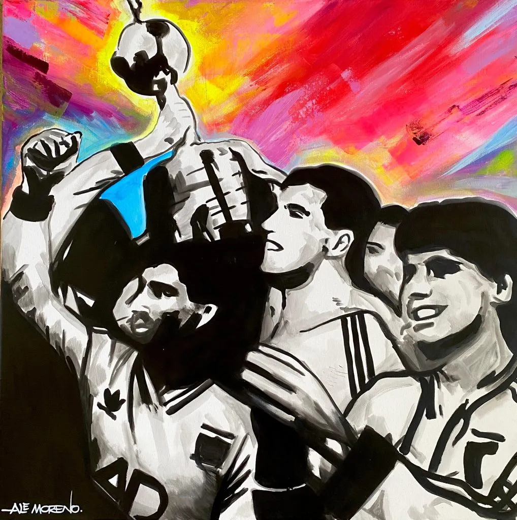 —Correa se acercó al cuadro, lo empezó a mirar y preguntó ‘¿dónde estoy yo?’. Me acerqué y le indiqué donde estaba él. Muchos del primer equipo me han pedido y se los he hecho, fotos jugando o recuerdos familiares. Hace menos de un año tuve el privilegio de pintar a Ronaldinho en una foto con su mamá, y vi que subió una foto y tiene el cuadro en su casa. A veces me saco un poco del contexto de dibujar solo momentos gloriosos o en la cancha, sino que me voy a momentos familiares o nostálgicos y eso le llega a la fibra de los jugadores. Más que jugadas, mucha gente las hace y las diseña pero a veces apelo a la emoción del jugador en temas familiares.