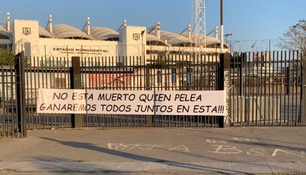 Esta tarde, en una de las rejas del Estadio Monumental apareció colgado un emotivo lienzo que decía: “No está muerto quien pelea. Ganaremos todos juntos en esta”.