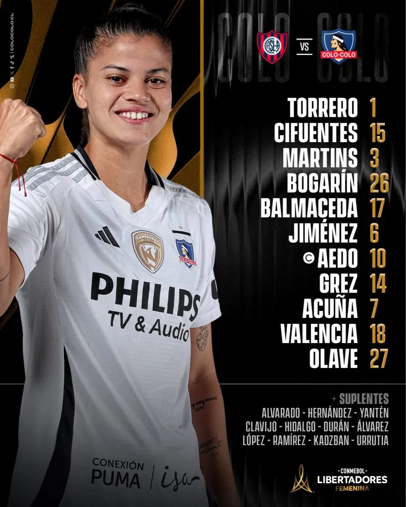 La lateral derecha Michelle Acevedo es la única ausencia de Colo Colo Femenino en este partido, debido a que está suspendida por tarjetas amarillas. Y son varias que si son amonestadas ante San Lorenzo se perderían el duelo de cuartos de final: Camila Martins, Corina Clavijo, Yastin Jiménez, Yanara Aedo y Yenny Acuña.
