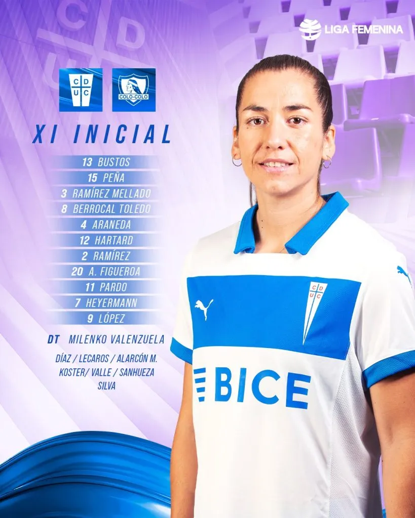 Tatiele Silveira define la formación titular de Colo Colo femenino la cual será con Ryan Torrero en el arco; Michelle Acevedo, Corina Clavijo, Dahiana Bogarín y Rosario Balmaceda en la defensa; Yastin Jiménez, Yanara Aedo y Yessenia López en el mediocampo; María José Urrutia, Mary Valencia y Yenny Acuña en la delantera.