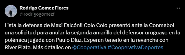Así lo informó el periodista de Cooperativa Deportes, Rodrigo Gómez. El reportero que cubre la actualidad alba comunicó que está “¡¡lista la defensa de Maxi Falcón!! Colo Colo presentó ante la Conmebol una solicitud para anular la segunda amarilla del defensor uruguayo en la polémica jugada con Paulo Díaz. Esperan tenerlo en la revancha con River Plate”.