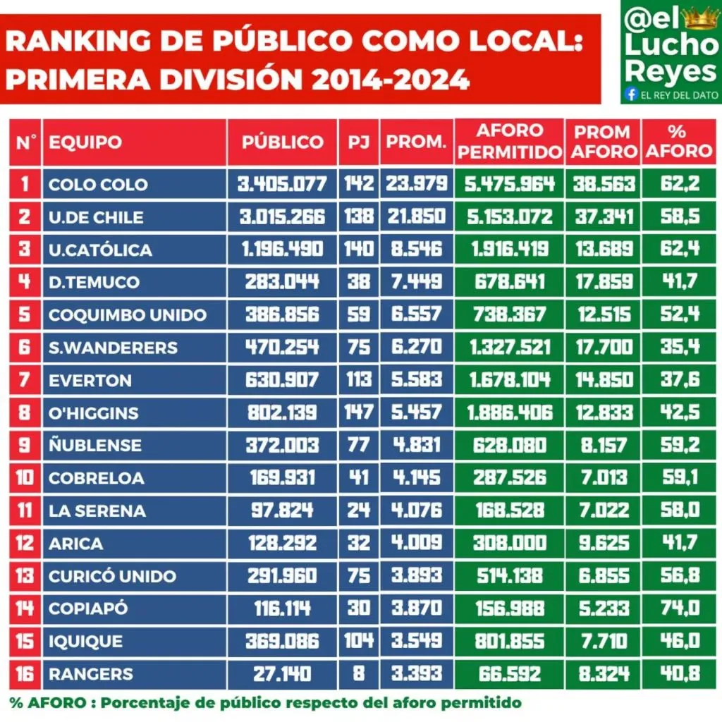 Según el dato entregado por el periodista especialista en estadísticas, Luis Reyes, Colo Colo promedia 23979 espectadores en sus 142 partidos jugados como local en la última década. Esto, solo considerando Campeonato Nacional y sin tomar en consideración Copa Chile, Supercopa o Copa Libertadores.