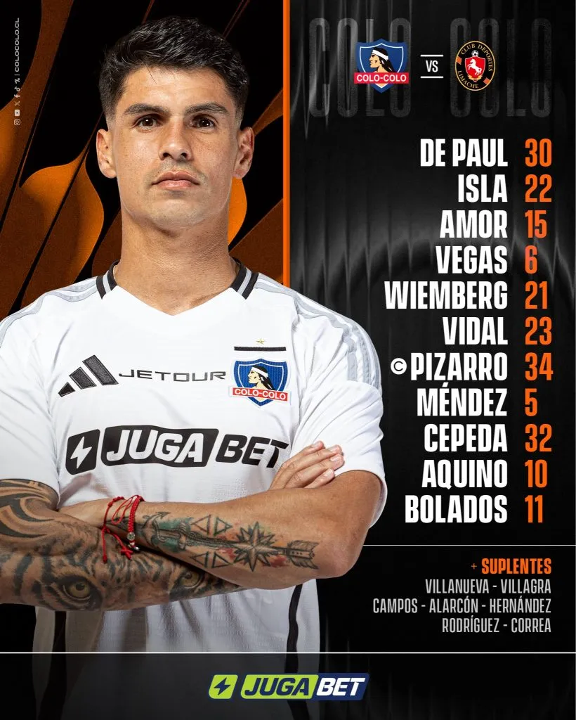 Colo Colo confirma su formación para este partido, la cual será con Fernando de Paul en el arco; Mauricio Isla, Emiliano Amor, Sebastián Vegas y Erick Wiemberg en defensa; Arturo Vidal, Vicente Pizarro y Víctor Felipe Méndez en el mediocampo; Lucas Cepeda, Marcos Bolados y Claudio Aquino en delantera.