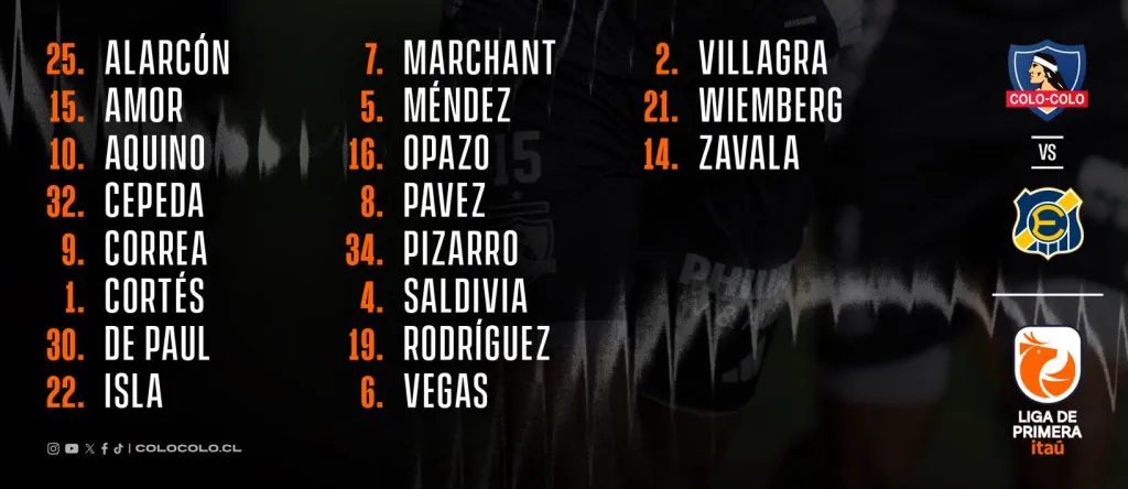 Jorge Almirón dio a conocer la oncena estelar para enfrentar a Everton: Fernando de Paul en el arco; Alan Saldivia, Sebastián Vegas y Erick Wiemberg en defensa; Mauricio Isla, Vicente Pizarro, Esteban Pavez, Lucas Cepeda y Claudio Aquino en el mediocampo; Salomón Rodríguez y Javier Correa en la delantera.
