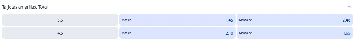 Si apuestas en JugaBet en el entretiempo del partido de Colo Colo con las tarjetas amarillas (Colo Colo ya tiene una), nos encontramos las siguientes cuotas:
