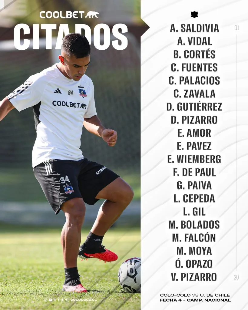 Una de las principales novedades que tendrá el elenco colocolino será el retorno de Arturo Vidal. El King no estuvo presente ante Huachipato y si bien viajó a Paraguay no fue parte de la convocatoria final. El futbolista de 36 años volverá y sería uno de los jugadores que el estratega argentino utilice como titular para el compromiso ante los Laicos. Junto a él, también destaca en la citación Vicente Pizarro, quien saldría por Vidal e iría a la banca de suplentes.