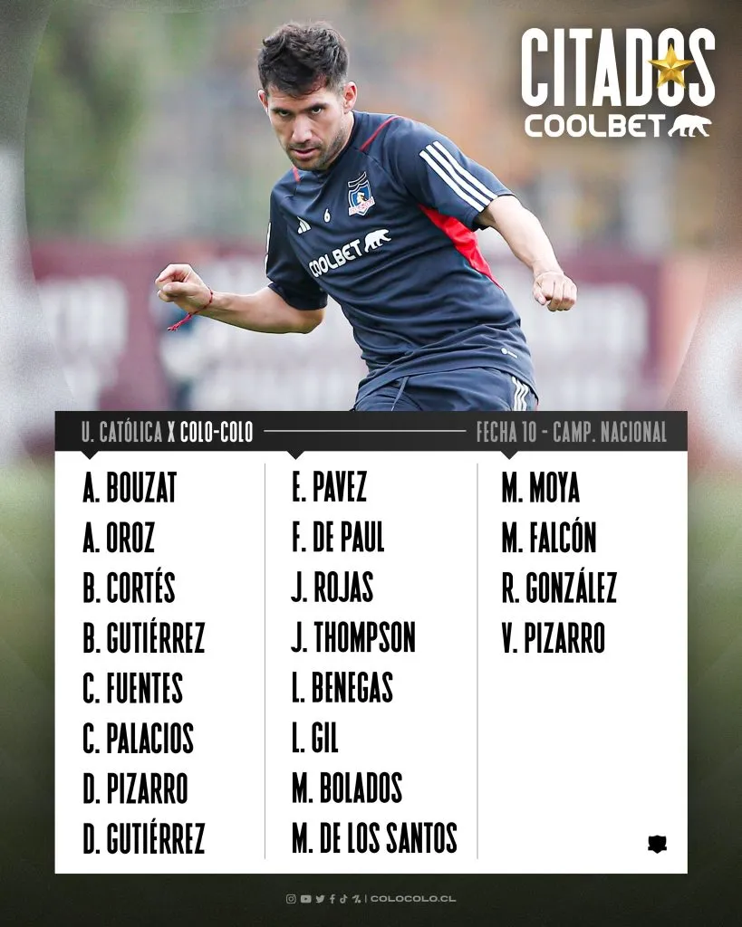 En la citación destaca Jordhy Thompson, quien volvió a las convocatorias en el duelo por Copa Chile, pero que no fue llamado entre los 18 jugadores que participaron de aquel compromiso. Eso sí, uno de los que no será alternativa es el delantero paraguayo, Darío Lezcano. Además, a él se sumará Marco Rojas, quien tampoco se encuentra en la lista.