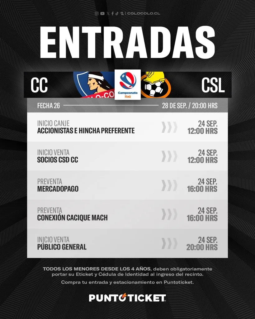 Respecto a los clientes de Mercado Pago y Conexión Cacique MACH, su preventa comienza a las 16:00 horas de hoy. Y por último, la venta de entradas para el público general arranca a las 20:00 horas, es decir, una hora y media antes del partido de esta noche entre Colo Colo y River.
