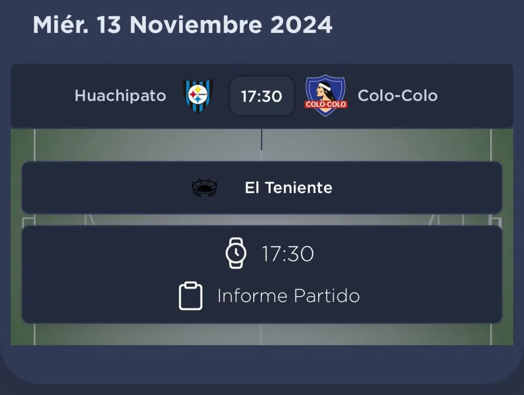 La ANFP indicó en su sitio web oficial que ya hay fecha para jugar los 12 minutos restantes del compromiso. El próximo miércoles 13 de noviembre a las 17:30 horas, en el Estadio El Teniente de Rancagua finalizará el partido entre Colo Colo y Huachipato, que se suspendió en febrero con el Popular ganando 2-0 al minuto 78.