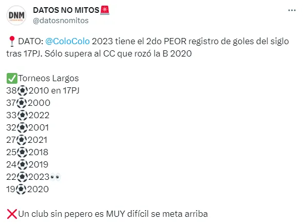 Según consigna la cuenta Datos No Mitos en Twitter, esta preocupante sequía del elenco dirigido por Gustavo Quinteros se posicionó como la segunda peor racha del siglo luego de 17 partidos jugados.