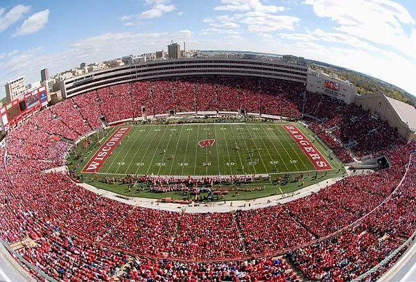 El antes y el después de la remodelación del sector sur Camp Randall Stadium (A la derecha en la primera foto, arriba en la segunda)