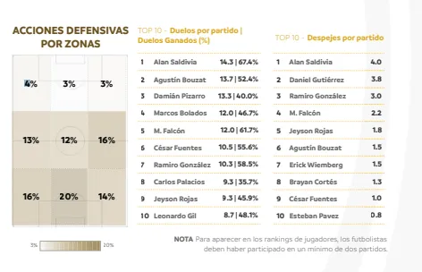 Más allá de los pobres números del Popular, uno que sacó cuentas alegres fue Alan Saldivia. El defensor tuvo su primera aparición en el torneo y fue el futbolista que más pases acertó por partido (48,7), el que más duelos tuvo y el que más ganó (14,3 duelos por partido con un 67,4% de efectividad) y, además, el que despejó más veces la pelota (4 por encuentro).