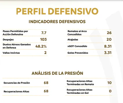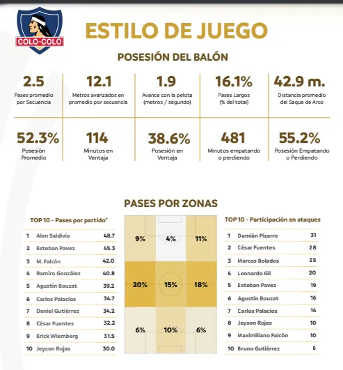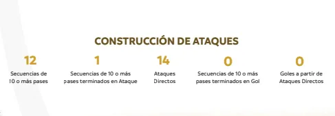 En cuanto al estilo de juego y la posesión de balón, los números tampoco fueron de lo mejor. En cada secuencia de juego, los Albos pudieron hilar sólo 2.5 pases en promedio y sólo se avanzó 12,1 metros en promedio. De todos los minutos disputados sólo en 114 se estuvo en ventaja y 481 fue empatando o perdiendo el partido.