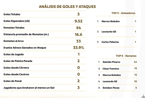 El ítem que deberá mejorar este equipo es en la ofensiva. Los tres goles convertidos, contrastan con los 9.52 que se esperaban, según la calidad de ocasiones creadas (el famoso valor xG). Fueron 94 remates totales que se realizaron en los seis partidos jugados, de los cuales sólo 33 fueron al arco. Lo más preocupante es que sólo se convirtió un gol de jugada y los otros dos fueron de penal. El que más remató fue Damián Pizarro con 22 tiros, lo sigue César Fuentes con 15, Marcos Bolados con 12, Leonardo Gil con diez y Esteban Pavez con ocho.