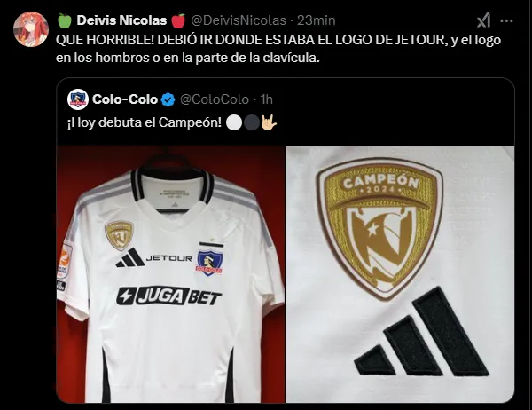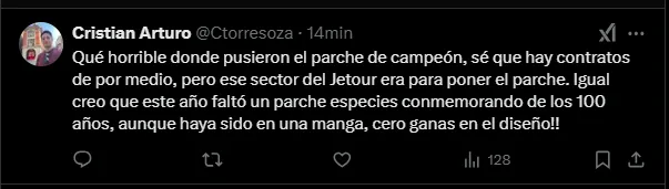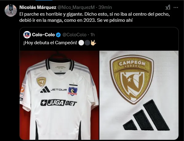 Esto, provocó el malestar de varios hinchas, ya que le quita simetría a la camiseta. Es que los espacios publicitarios ya definidos en la tricota hacen imposible la ubicación del parche de campeón en otro lugar, por lo que para que luciera, tuvieron que estamparlo justo arriba de la marca.