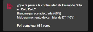 Una vez conocida la situación del argentino, en DaleAlbo quisimos conocer la opinión del hincha. En nuestra página web realizamos una encuesta para saber el comentario del hincha, al igual que en YouTube durante DaleAlbo AM, como en nuestro canal de Whatsapp, con la siguiente pregunta: ¿Qué te parece la continuidad de Fernando Ortiz en Colo Colo?