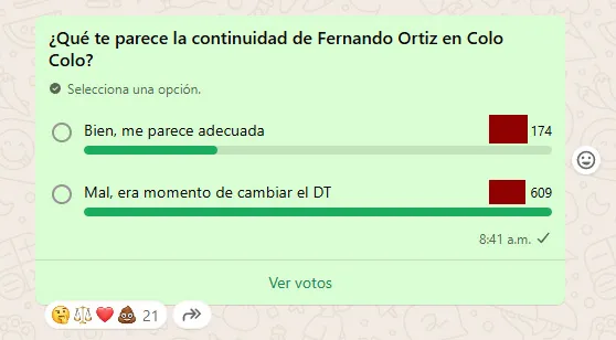 Mientras que en nuestro canal de Whatsapp, también se mantenía la tendencia de nuestra web. Más de 783 personas participaron donde la opción “mal, era momento de cambiar el DT” se impuso con el 77% de los votos (610), mientras que la opción “bien, me parece adecuado” obtuvo el 23% restante (174).