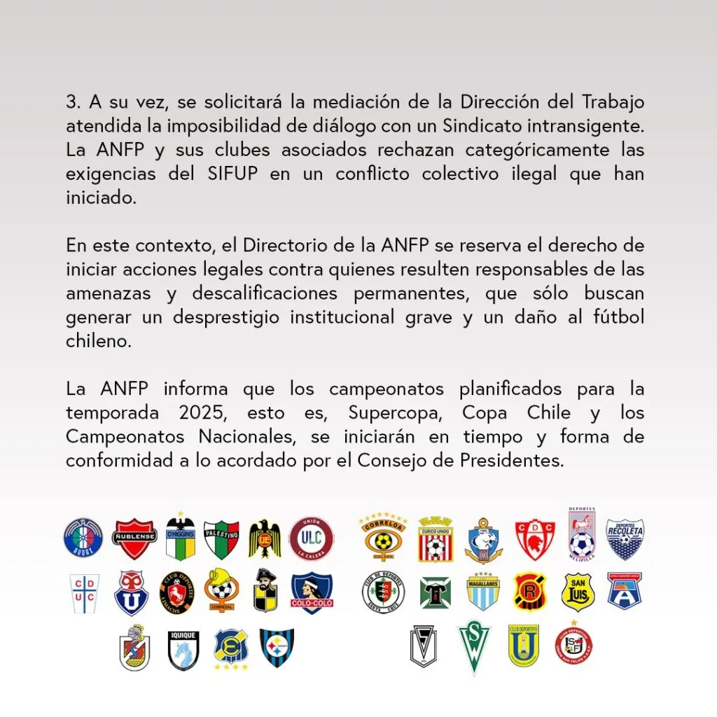 Junto con medidas anunciadas en la Dirección del Trabajo (DT), como la evaluación de un dictamen, informó la ANFP que realizará la solicitud de “mediación de la DT atendida la imposibilidad de diálogo con un sindicato intransigente”. Además, a pesar del derecho a huelga que está vigente en Chile, el comunicado indica que “la ANFP y sus clubes asociados rechazan categóricamente las exigencias del Sifup en un conflicto colectivo ilegal que han iniciado“.