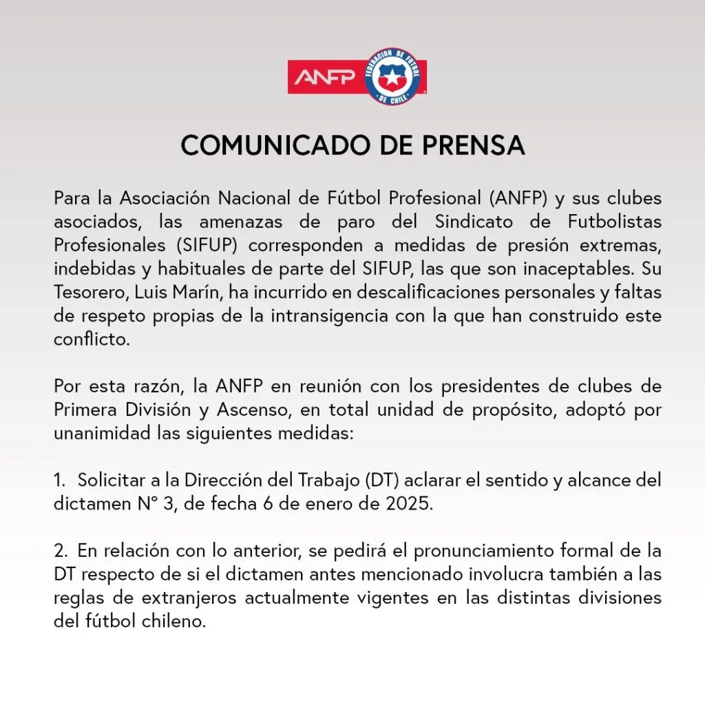 “Para la ANFP y sus clubes, las amenazas de paro del Sifup corresponden a medidas de presión extremas, indebidas y habituales, las que son inaceptables. Su tesorero, Luis Marín, ha incurrido en descalificaciones personales y faltas de respeto propias de la intransigencia con la que han construido este conflicto”, comienza el poco conciliador comunicado.