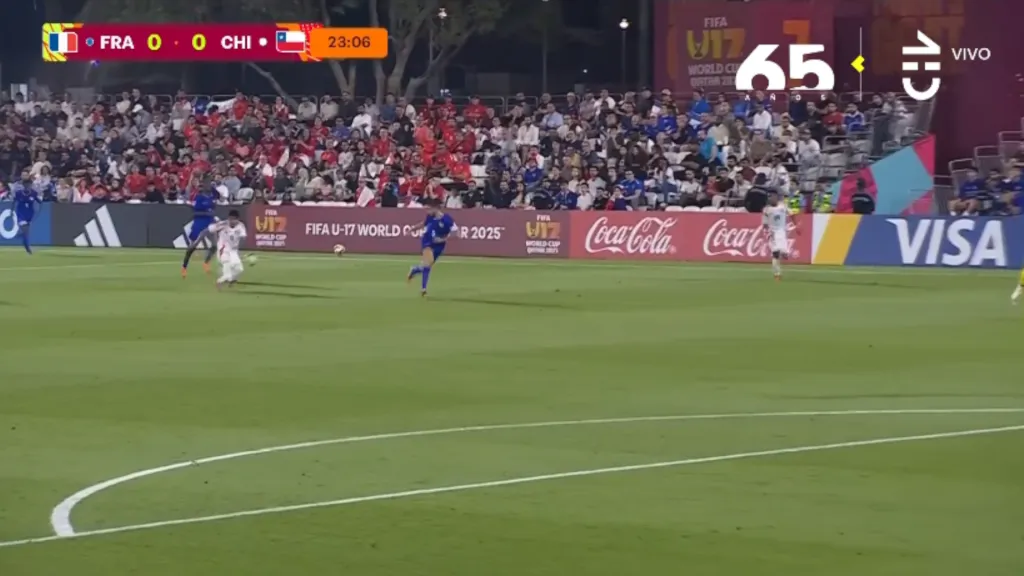 Yastin Cuevas llegaba por el sector derecho y habilitó a Jhon Cortés que avisa a Francia. Chile ha tenido varias en el primer tiempo.
