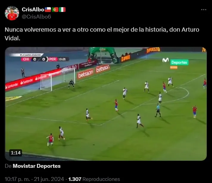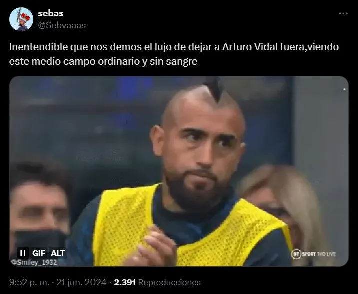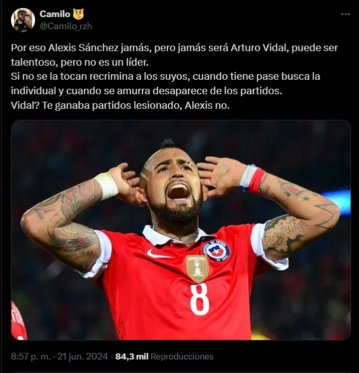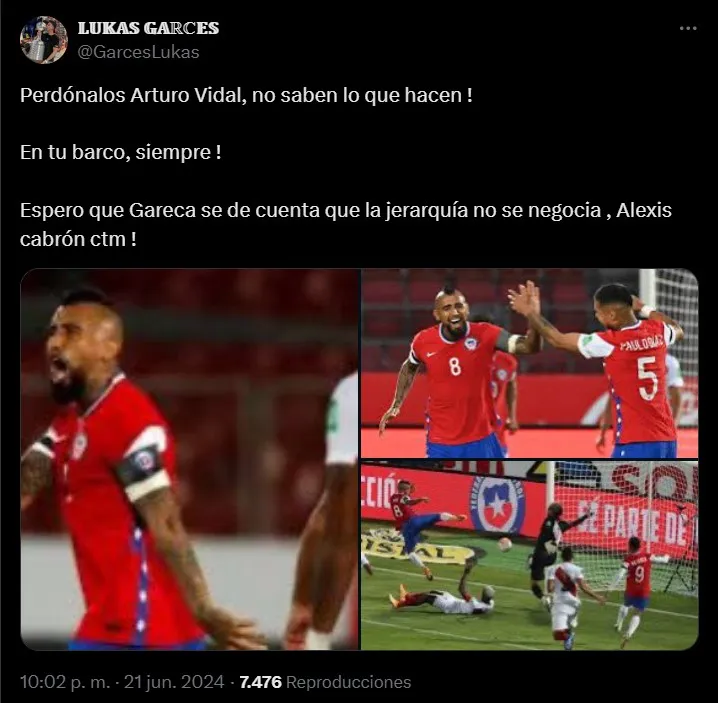 “¡Perdónalos Arturo Vidal, no saben lo que hacen! En tu barco, siempre. Espero que Gareca se dé cuenta que la jerarquía no se negocia”, señaló otro. Mientras tanto, uno se encargó de criticar a Darío Osorio de manera indirecta: “Arturo Vidal viendo quien ocupa la 8 ahora en la selección”, acompañada de un King enojado.
