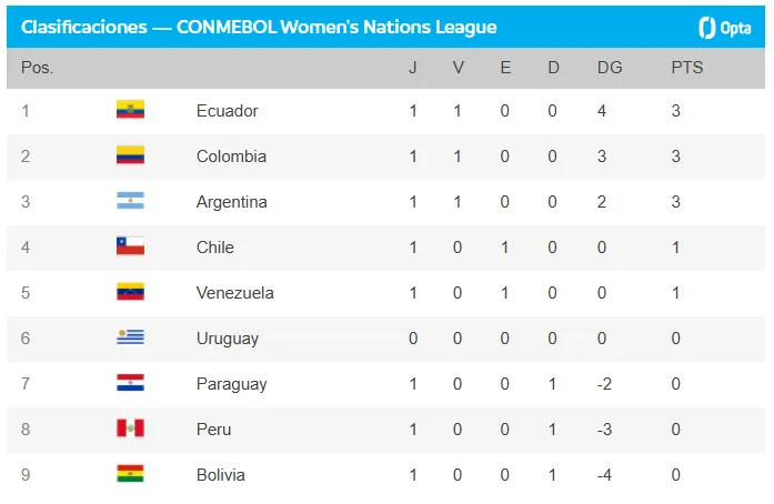 Mientras que Paraguay, con la presencia de Dahiana Bogarín, cayó por 3-1 ante Argentina. Cabe recordar que como Brasil organiza el próximo Mundial Femenino no participa de esta Liga de Naciones Femenina, por lo que habrá un equipo libre, que en la primera jornada fue Uruguay.